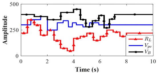 In the simulations, it is assumed that the proposed network is exposed to various disturbances, including the voltage of the PV system Vpv, the battery voltage VB, the capacitance bank voltage VS, and the load variations. It should be noted that in the following, it is assumed that these disturbances are independently altered, and their curves are given in Figure 3 and Figure 4.
