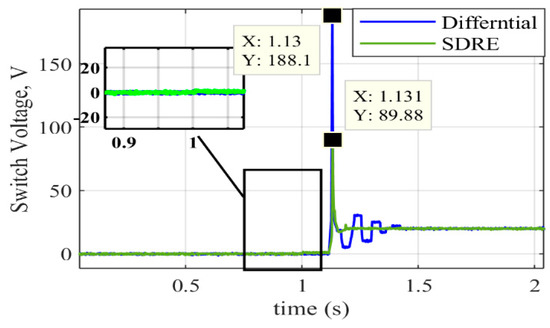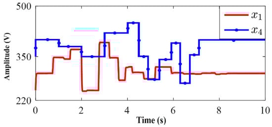 Because of the rapid increase in the fault current in a dc microgrid, it is necessary to detect faults at the right time and isolate the faulted segment. The first part of the results is related to the voltage control of the dc bus via the SDRE controller and the second part is dedicated to the SDRE observer results for fast fault detection. In both parts, it is necessary to first consider a state-dependent coefficient (SDC) representation of the Equation (1). The coefficients of the state equation were extracted as follows. The SDRE controller objectives for the studied network are the setting of the output voltages of the PV system, the battery, the capacitor bank and the dc bus, which can be used for control purposes using , and inputs. For this purpose, the optimal equilibrium point of the system is obtained with zero placement of the right side of Equation (1). The desired equilibrium point is obtained using the parameters of Table 1 as follows: