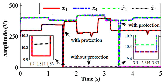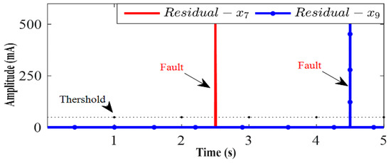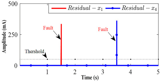 In the simulations of this section, it is assumed that a fault occurs at 1.5 s in the C1 capacitor and another fault in 3.5 s in the C4 capacitor. As shown in Figure 10, at this time, the C1 voltage decreased from 300 V to 10 V, and the voltage of the C4 capacitor decreased from 400 to 10 V, and correspondingly, in Figure 11, the output current of the PV system and the battery decreased. According to Figure 10, the fault detection time for the proposed SDRE method is 30 ms. Meanwhile, the fault detection system compares the actual system output with the output of the SDRE observer and formed a non-zero residual current, as shown in Figure 12, which, with the definition of the appropriate threshold—here the threshold is assumed 50 mA—makes it possible to detect the fault. As mentioned, among the most important issues in the field of fault detection is to not identify disturbances as faults. As shown in the previous section, despite the above-mentioned disturbances, Figure 11 shows that the fault occurrence system did not trip any of these times.