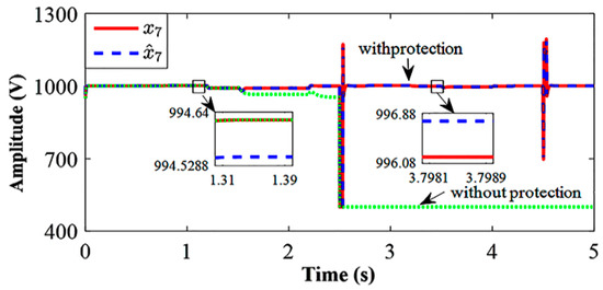 In order to show the proposed fault detection scheme’s ability and its non-dependence on the fault location, a fault occurred at 2.5 s on the output of the C7 capacitor, and another in 4.5 s had occurred on the load bus. As shown in Figure 13 and Figure 14, at a moment of 2.5 s, the capacitor voltage C7 decreased from 1000 to 500 V and the load bus voltage reduced from 1000 to 500 V. In this case, as shown in Figure 15, the capacitor-bank output current has increased. As it can be seen from Figure 16, the fault detection time for the proposed SDRE method is 30 ms. It is apparent in Figure 16, that the threshold was considered 50 mA which was feasible for fault detection.