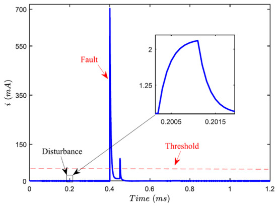 In fact, for the sake of generalization, we can say that the threshold value for the fault detection occurrence is chosen to be greater than the disturbances range. As can be seen, the maximum non-zero residual current of C1 is less than 3 mA in the disturbance condition, whereas the non-zero residual current of the C1 is about 700 mA when the fault occurs. As a result, in order to provide the margin of assurance of the performance of the protection system, the threshold value of the fault occurrence is considered as 50 mA, so that both the fault occurrence is quickly detected and the disturbance is not considered as a fault.
