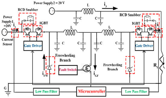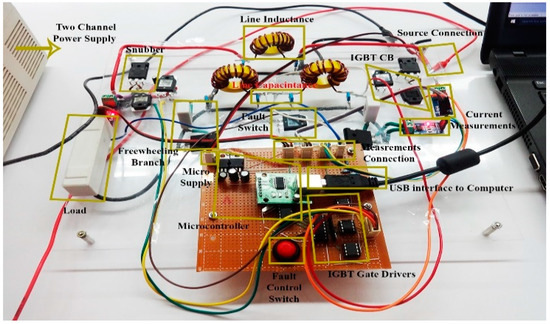 The amount of threshold for the differential fault detection was assumed as 20% of the quantity of the simulation in [15]. In this test, the measured current analog–digital (A/D) transformation is fulfilled in a 50-µs interval. The use of a microcontroller, IGBTs gate drivers and a schematic diagram of the prototype experimental test bed implementation are shown in Figure 18 and Figure 19. The red light of light emitting diodes (LEDs) of current measurement modules indicate the link between the current sensor and the microcontroller.