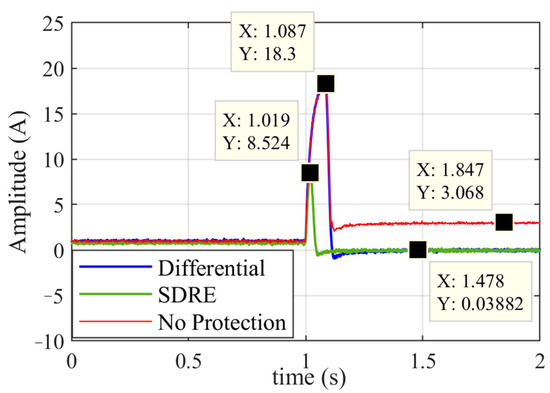 Figure 20 shows the residual current comparison of C1 capacitors during the fault occurrence without protection, with differential protection, and with SDRE observer protection. It is apparent, the transient three A fault current passes through the circuit without protection. While, by investigation of the SDRE-observer and the differential method figures, it can be deduced that the proposed SDRE observer protection detects the fault incidence more quickly. Obviously, the current value attains zero after the trip of IGBTs.