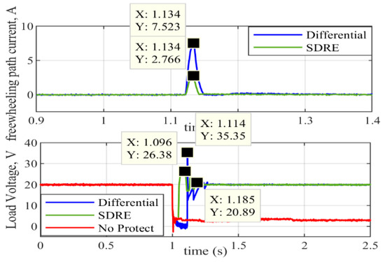 Figure 21 shows the voltage of dc demand and the freewheeling current without protection, with differential, and SDRE observer protection modes. It is apparent that the fault detection time for the proposed SDRE method in experimental implementation is 96 ms and for the differential method proposed in [15], it is 114 ms. Additionally, load voltage when using the SDRE observer protection is restored faster and has a smaller transient-current. The load voltage attains a small value without protection. Due to the fast fault detection and consequent prevention of huge rises in the fault current, the SDRE observer protection leads to a lower current in the freewheeling path rather than the differential protection method, i.e., reduced protective system expenses and the conceivability of utilizing the simpler, smaller diodes. Figure 22 demonstrates the voltage of IGBT breakers with snubber attendance in differential and SDRE observer modes. Exploiting the SDRE observer protection led to a reduction in the pick of voltage on the IGBT breakers, which permitted the utilization of breakers with lower nominal insulation voltages. In addition, by taking advantage of the SDRE observer controller, IGBTs tolerated lower transient voltages that caused a reduction in the possibility of IGBT breaker failure.