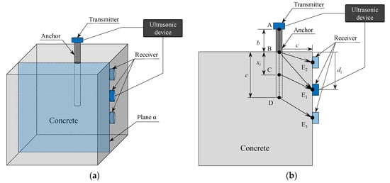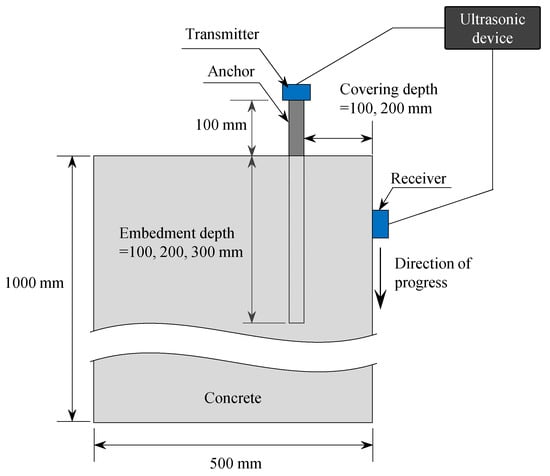 Accurately estimating the embedment depth of the anchor bolt using non-destructive testing (NDT) methods is thus necessary to solve such problems. The application of NDT methods such as ultrasonic, impact-echo, impulse thermography, radar, and acoustic emission is being extensively studied because of the possibility to inspect internal damages in the structure without mutilating it while preserving the quality [,,]. Among these methods, those using ultrasonic pulses offer easier measurement as well as easier analysis that make them widely utilized for estimating the strength, analyzing the durable performances and evaluating the setting time of concrete according to various mix conditions and ages as well as detect defects and cracks occurring at the surface [,,,,]. Demirboğa et al. proposed a model estimating the compressive strength of concretes with various mix conditions by using the measured ultrasonic velocity as input data []. Yeih and Huang utilized the amplitude attenuation method in ultrasonic testing to evaluate the corrosion damage of the steel reinforcement in concrete. These authors experimentally proved the existence of a relationship between the average amplitude attenuation, the circuit potential values, the instantaneous corrosion rate, and the thickness loss []. Watanabe et al. evaluated the corrosion-induced crack and rebar corrosion by ultrasonic testing and revealed that the ratio of the propagation distance was characterized by the attenuation, which was correlated with the damage of rebar corrosion []. Climent et al. experimentally demonstrated that the crack width at the surface of the concrete could be detected by ultrasonic techniques [].
