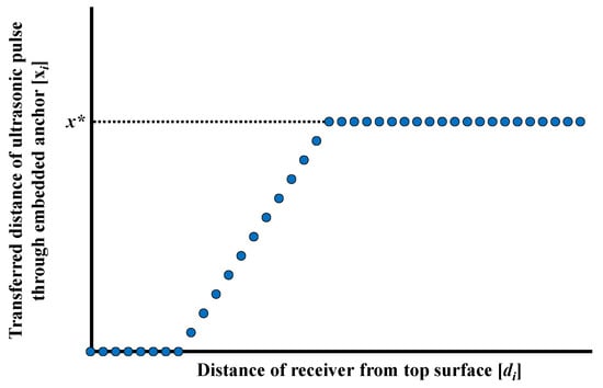Figure 2 schematically illustrates the ultrasonic test conducted for estimating the embedment depth of the anchor bolt buried in concrete. Figure 2a,b show the three-dimensional view of the test specimen and set up and the cross-section of the plane α, respectively. The anchor bolt is disposed vertically in concrete and perpendicularly to the exposed upper face of the concrete block. It is assumed that the concrete cover in the direction perpendicular to the paper is sufficiently thick, and the surface wave arrives later than the P-wave moving along the section in the figure. It is also assumed that the reflection and refraction generated at the boundaries of the aggregates included in concrete have practically no effect and can be ignored []. The adopted ultrasonic P-wave has a frequency spectrum of 50–100 kHz that allows it to penetrate concrete and steel. The utilized ultrasonic device is capable of measuring the time gap between the time at which the pulse is emitted and the time at which the receiver detects it. The ultrasonic transmitter is installed at the top of the anchor bolt and the receiver is disposed on the concrete side in the same plane as that of the anchor bolt and performs the measurement by moving vertically. When the ith measurement is done, the position (m) of the receiver and the arrival time (s) of the ultrasonic pulse are recorded. The measured receiver is taken sequentially from the top to the bottom:
