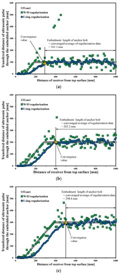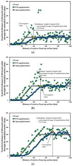 Figure 5 and Figure 6 present the results of the simulation for the cases with a cover thickness of 100 and 200 mm, respectively. The convergence value where starts to converge was determined by the engineer’s decision. The final value was decided to be the average of the transferred distance of the ultrasonic pulse through the embedded anchor bolt after the convergence. As shown in Figure 5 and Figure 6, the scattering of the test data is very wide before the introduction of regularization, so it is impossible to determine the point at which the value begins to converge. Therefore, it is necessary to find a convergence value by reducing the scattering degree of test data by introducing regularization and using an appropriate regularization factor. In this study, an optimal value of 0.02 for the regularization factor was obtained empirically and used for solving Equation (6). If a regularization factor higher than 0.02 was used, the scattering degree can be reduced, but there was a disadvantage in that the data convergence is delayed. As shown in Figure 6c, when a regularization factor of 0.02 was used, the convergence value could be determined within the range of the x axis (0–1000 mm) in the case of the E300C200 specimen. Therefore, the regularization factor of 0.02 was used for the equal comparison of all specimens. The determination of the regularization factor was discussed at the end of the present section. The resulting estimated embedment depth of the anchor bolt for the specimens E100C100, E200C100, E300C100, E100C200, E200C200, and E300C200 was, respectively, 100.1, 202.2, 298.4, 102.9, 199.9, and 315.9 mm, which showed respective errors of 0.1, 1.1, 0.5, 2.9, 0.0, and 5.3% compared to the exact depths of 100, 200, 300, 100, 200, and 300 mm. Table 2 summarizes the results. Even though a white noise of 3% was introduced, the error remained below 5.3% in all six cases. At the exception of case E300C200, the error remained at an ignorable level. Consequently, the proposed method appeared to provide good results against the white noise disturbance of the measuring device.