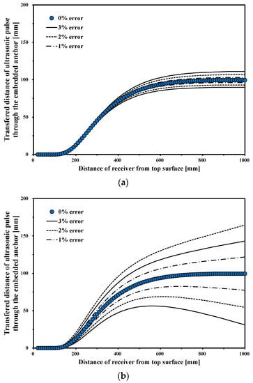 Variation in transferred distance of ultrasonic pulse through the embedded anchor bolt according to the error of ultrasonic velocity in the anchor bolt and concrete: (a) error of ultrasonic velocity in the anchor; and (b) error of ultrasonic velocity in concrete.