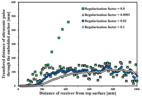 Effect of the regularization factor on the transferred distance of the ultrasonic pulse through the embedded anchor bolt.