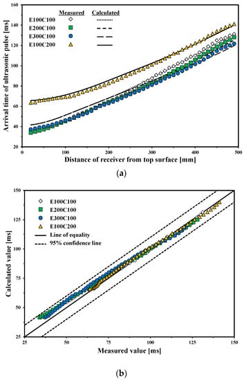 Arrival time of ultrasonic pulse in the specimen with the different embedment lengths of the anchor bolt and cover thicknesses: (a) the variation in arrival time of the ultrasonic pulse according to the distance of the receiver from the top surface; and (b) the measured value vs. calculated value.