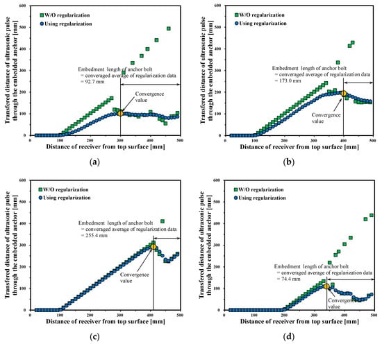 Figure 11 plots were obtained by substituting the measured arrival time of the ultrasonic pulse into Equation (6) with respect to the position of the receiver for the considered specimens. Here, the adopted P-wave velocities in the anchor bolt and concrete were those actually measured in the specimens and were, respectively, 5906 and 4126 m/s. For specimen E100C100, the value of 0.02 that was used in the numerical verification was applied for the regularization factor and the corresponding results are shown in Figure 11a. However, for specimens E200C100, E300C100 and E100C200, the transferred distance of the ultrasonic pulse through the anchor did not converge within the measurement range when using 0.02 for the regularization factor and the embedment length of the anchor could not be determined. Subsequently, the regularization factor was adjusted to 0.01 to secure the convergence for the specimens E200C100, E300C100 and E100C200. This decrease in the regularization factor resulted in a slight loss of the accuracy in the estimation of the embedment length of the anchor due to the wider dispersion of the results. The results for E200C100, E300C100 and E100C200 are plotted in Figure 11b–d, respectively. The values of the measured arrival time of the ultrasonic pulse include noises from various variables such as the error in the P-wave velocity in concrete and the anchor, the error brought by the material heterogeneity of concrete, the error due to the difference in the position of the transmitter and receiver, and the error caused by the refraction and reflection of the wave at the interface between the anchor and the concrete [,]. However, the results were seen to resemble the theoretical result shown in Figure 3.