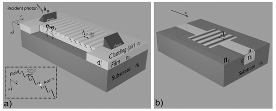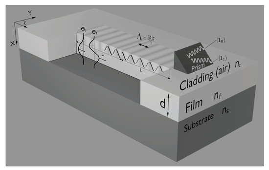Let us consider a standard integrated photonic device consisting of, for example, an integrated waveguide 1D (one-dimensional) with refractive index (slab guide) that supports two optical modes and . These modes are collinear and travel in the z-direction with propagation constants and , that is wave vectors in the z-direction defined as , where is the frequency of the mode and N is the effective index [10]. The mentioned modes are coupled by an integrated grating present in a region of the slab guide, as shown in Figure 1a), where relevant parameters are indicated, that is substrate index , film index , cover index , and film thickness d. The grating is represented, for example, by a periodic modulation (perturbation) of the electrical permittivity [10],