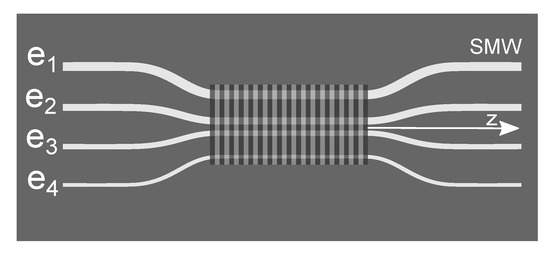 The second example consists of using single-mode channel guides coupled by OGs in order to simulate the interaction between a particle (or physical system) with spin s and a magnetic field. This can be implemented by using a number N=+1 of optical modes excited in N channel waveguides and coupled by OGs, as shown in Figure 2 for the particular case of four guides (spin s=). We must stress that coupling between parallel SMWs can be also described by the Heisenberg quantum equations given by Equation (18). In order to simulate spin-magnetic field interaction, either the strength of the OGs or the separation between consecutive SMWs has to be adjusted, and therefore, proper coupling strength values with j=, between consecutive guides, are obtained. Likewise, the SMWs have to be designed with different propagation constants (asynchronous guides) by changing, for example, the depth of each channel waveguide. Finally, it is well known in integrated optics that for asynchronous DCs assisted by optical gratings, the coupling due to the overlapping fields is negligible. As a particular example, let us consider spin . The general equation system is given by: