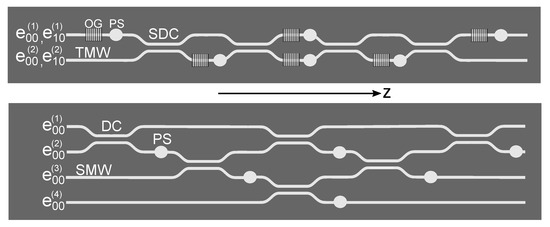 Next, we present a general unitary transformation SU(4) by using optical gratings. With this example, we want to show that OGs allow reducing the number of paths required for constructing a simulator. Indeed, an SU(4) simulator is formed by four paths implemented by SMWs with optical modes (j=1, ...,4), six DCs, and six Phase Shifters (PSs), as shown in Figure 3 (bottom). However, if OGs are used, we only need two paths, that is TMWs with modes (j = 1, 2) and six OGs, as shown in Figure 3 (up). In this case, we also use Selective Directional Couplers (SDCs) (a SDC always performs an X transformation in one mode, and the other mode undergoes an identity transformation). Note that the number of paths was reduced by half because OGs act on collinear modes, unlike directional couplers, which act on codirectional modes. Obviously, if we had used OGs with four modes, we could reduce the number of paths by 1/4. Overall, we will be able to reduce the number of paths by if we use OGs with a number d of collinear modes. Ultimately, we can take advantage of the OGs to increase integration and thus to implement more flexible and scalable photonic simulators such as for example boson sampling ones [24], where the number of paths would be reduced by half. In short, the number N of paths of any required SU(N) transformation [25] could be reduced up to .