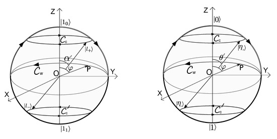 It is easy to prove that both states have the same phase, that is , and the modulus is given by and ; therefore, the state crosses the point of the photonic Bloch sphere as indicated in Figure 4 for . Now, we must recall that partial cycles also generate geometric phases, which can be calculated by closing the end points of the open cycle by a geodesic line [28,30]. In our case, the corresponding geodesic lies along the meridian at the plane , from point to initial point . In short, the state has followed a wedge circuit , as shown in Figure 4. Now, we calculate the subtended solid angle by this wedge circuit. It is easy to check that a wedge circuit with angle subtends a solid angle ; therefore, the geometric phase is , which is just the global phase obtained in Equation (60). It is worth underlining that in this case, the geometric phase is not hidden, and therefore, the dynamical phase does not have to be eliminated. Moreover, this geometric phase can be also obtained in a atom-optical field system out of resonance by using -pulses, with the first optical field with low amplitude (Z gate) and the next with a higher amplitude . By using the simulation parameters given by Equation (34), the geometric phase would be .