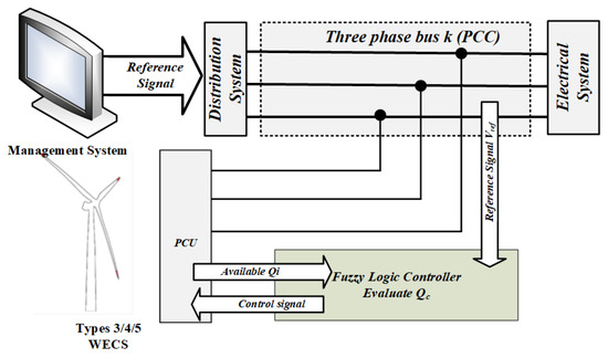 However, the actual amount required for compensation to mitigate the voltage and keep it within a preset code could be different from the available from the inverter Q i . The actual amount is computed using control methods such as drop control or fuzzy logic controllers. In this paper, the voltage deviation is evaluated, and fuzzy rules are implemented to compute the required reactive power Q c to maintain the voltage at the PCC of the WPP. The developed control depends on a reference signal sent by the management system. In distribution systems, two objectives are defined to control the voltage level as shown in Figure 4.