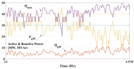 Equation (8) is subject to a set of equality and inequality constraints such as power balance equation, minimum and maximum power generation for each power plant. The economic load dispatch is usually solved repeatedly during the FQSTS simulation every 15–30 min. Within this time frame, control actions including steady-state frequency error calculation and power participation are executed to guarantee power balance in the system [42]. Control action of the automatic voltage regulation (AVR) is included in the simulation for all power plants. The generated reactive power is subject to the excitation system limits which is described by: