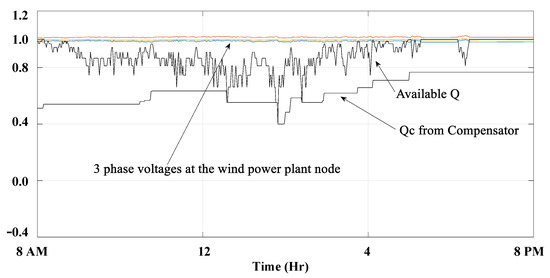 The use of PQ correctors such as STATCOM is one of the solutions to recover the deteriorated PQ issues. It aims to help the WPP in situations of voltage dips, voltage regulation, and power factor control. Additionally, STATCOM can improve many PQ issues at the PCC such as improving transient stability and stabilizing power flow [33,34]. Moreover, the STATCOM stimulates voltage stability by reactive power regulation. It injects reactive power compensation to or from the grid for voltage variations at the PCC. In the case of low voltage, the STATCOM injects reactive power to the grid to increase the voltage. When voltages levels are high, the STATCOM can absorb reactive power to decrease the system voltage. An example is presented in [33], explaining the effect of STATCOM in improving the voltage level in the system containing DFIG WTG. A 60 MVAR reactive load in the system causes a sudden voltage drop. Therefore, the STATCOM reactive power helps to increase the voltage level of the system. Additionally, the provision of reactive power at the WPPs connection point reduces the deviation of node voltage level from 0.946 p.u. to 0.979 p.u.