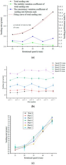 - Both the stability variation coefficients of the total seeding rate and the consistency variation coefficient of the seeding rate between each port were very low, with the maximum value being 2.37% and 4.89%, respectively. The total seeding rate Y (g/min) increased with the rotational speed of the gear disc X (r/min) according to a polynomial fitting relationship Y = 0.46014X2 − 20.7614X + 544.78086 with R2 = 0.9934.