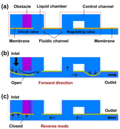 - Zhang, X.; Zhang, Z. Microfluidic passive flow regulatory device with an integrated check valve for enhanced flow control. Micromachines 2019, 10, 653. [Google Scholar] [CrossRef] [PubMed]