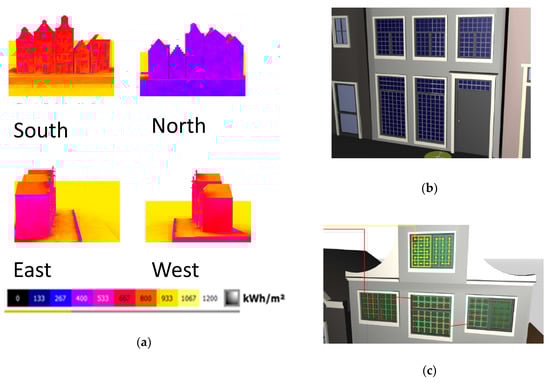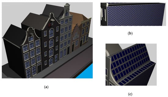 A typical historical canal house model is investigated in this subsection, respecting the building’s historical appeal (Figure 2a). Custom-made BIPV modules of monocrystalline silicon with typical wall bricks dimensions (210 mm × 100 mm × 50 mm) and colour were proposed (Figure 2b) []. Similarly, BIPV roof tiles were used to provide a non-intrusive appearance (Figure 1c) [].