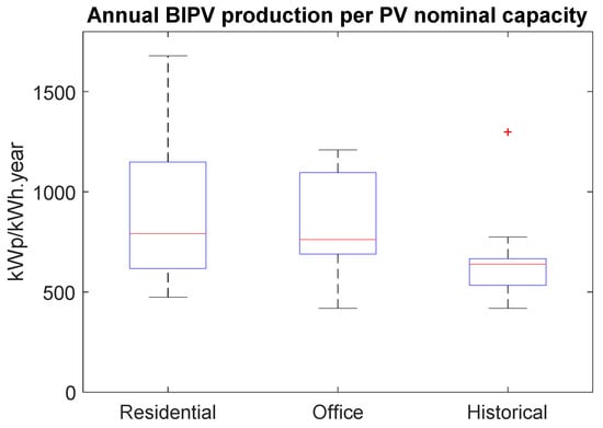 Annual BIPV production per photovoltaic (PV) nominal capacity installed for three types of buildings.