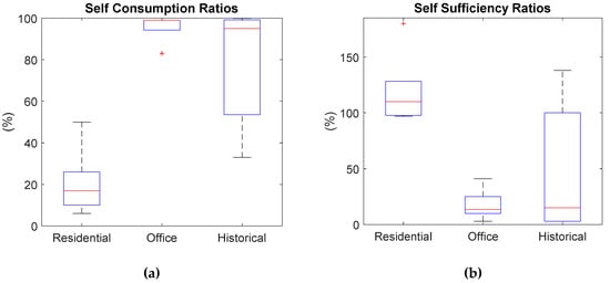 Self-Consumption (a) and self-sufficiency (b) ratios in percentages for three types of buildings.