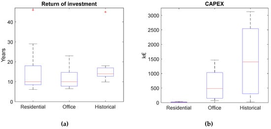 Return of investment (a) and capital expenditure (b) for three types of buildings.