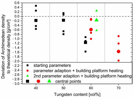 Figure 1 presents the measured Archimedean density in comparison to the theoretical value. With an increase in tungsten content from 40 to 50 and 60 vol% (black data points), a descending trend in density was observed. This behavior can be explained by the fact that the tungsten particles had an influence on process-relevant properties such as thermal conductivity or absorptivity of the laser energy. Therefore, the boundary conditions in the powder bed changed. This leads to the necessity of adapting the process parameters in order to counteract the descending densities with increasing tungsten content. Consequently, adapted DoE matrices were applied to shift and expand the process parameter variations. Additionally, the powder bed, which was not heated for the starting parameters, was heated to ca. 90 °C. These measures led to an improvement in the overall density level in the case of 60 vol% tungsten. However, a further descending density from 60 to 70 vol% tungsten was monitored (red data points). Concentrating on the 60 vol% tungsten volume content, another optimization iteration of the process parameters resulted in densities close to the theoretical density (green data points).