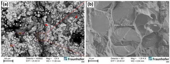 In the backscatter image (a), it can be seen that the heavy tungsten particles (bright grey) were distributed over the whole sample surface. The dark areas represent the lighter steel matrix phase. However, porosity was clearly visible, e.g., the dark hole at the right side of the image. Regarding the failure behavior, tungsten intraphase failure and a few cracks in the steel matrix can be stated (indicated by red arrows). Having a closer look at the failure surface (b), it can be observed that the tungsten particles were thoroughly embedded in the steel matrix. Thus, the tungsten particles were not ripped off the matrix during the tensile test, but cleavage planes of the particles dominated the failure surface. This indicates that the contact between the matrix and reinforcing particles was strong enough to withstand the applied tensile forces.