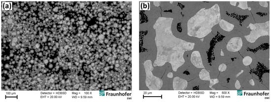 Generally, multiple combinations of materials are possible. Thus, metallic particles as well as ceramic components can be applied as filling material of a metallic matrix. However, L-PBF-related studies focus on ceramically reinforced MMCs, and only some literature on metal–metal composites is available. An example for the latter is tungsten heavy alloys, which are manufactured by conventional process routes like infiltration techniques. First attempts to generate similar material systems by laser powder bed fusion (L-PBF) are described in the works concerning W-Ni alloys by Zhang et al. [], and regarding W-Ni-Fe-Co composites by Chen et al. []. Zhang et al. demonstrate the influence of the Ni content on the microstructure evolution. The microstructure changes from bar-shaped to dendritic to honeycomb structure with increasing Ni content. In addition, W dendrites are observed indicating a partial melting of the particle []. This study emphasizes the importance of microstructural investigations of new MMC systems. Chen et al. report on the effects of laser process parameters and chemical compositions on densification, microstructures and tensile properties giving evidence of the complexity of this topic [].