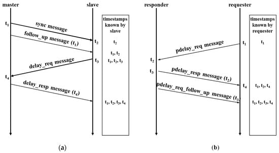 Figure 1a presents the synchronization mechanism of the E2E method. In the E2E method, four types of synchronization messages are exchanged between the master and slave, through which the delay and offset are calculated and time is synchronized. First, the master transmits a synchronization message to the slave at time t1, and the slave receives it at time t2. Next, the master node stores t1 in a follow-up message and transmits it to the slave node. The slave then transmits a delay-request message at time t3, and the master receives it at time t4. Finally, the master stores t4 in the delay-response message and transmits it to the slave. Through this process, the slave can acquire four timestamps (t1, t2, t3, and t4) to calculate the offset and propagation delay. Equations (1) and (2) are used to calculate the delay and offset between the master and slave nodes. In this process, the network must provide a link with a symmetrical structure, in which the transmission rates of the master and slave in both directions are identical.