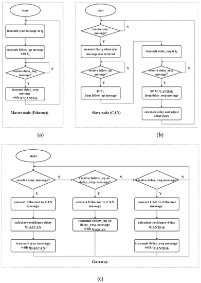 Synchronization algorithm of the master and slave nodes in the CAN–Ethernet network: (a) master node (Ethernet), (b) slave node (CAN), and (c) gateway.