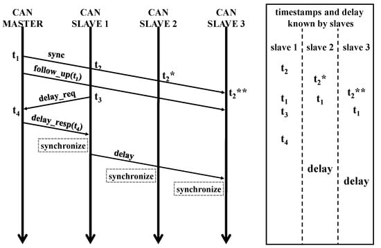 The PTP procedure can be directly applicable to an homogeneous CAN network. Unlike Ethernet, which uses a 1:1 connection, a CAN network employs bus topology where broadcast transmission is readily available [20]. This feature can be used to synchronize all the CAN nodes without repeating PTP procedure for each node. We can design the procedure so that a master node can transmit synchronization and follow-up messages only once. However, slave nodes will try to transmit a delay-request message almost simultaneously, which will cause message collisions. To prevent these collisions, we may assign different IDs for each delay-request message, which will increase the duration of the synchronization process and the network traffic. Instead, we selected a single slave node to perform the delay calculation using Equation (1) and let the node broadcast the results to other nodes. Figure 5 shows the method for sharing the delay between slave nodes. First, the master transmits synchronization and follow-up messages to all slaves, and slave 1 stores t1 and t2. Slaves 2 and 3 share t1, but because the reception time differs, they store t2* and t2**, respectively. Next, the time synchronization procedure is performed for only slave 1 to calculate the delay. The calculated delay is transmitted to the remaining slaves, and the previously-stored timestamps (t1 and t2*, or t1 and t2**) are used to calculate the offset using Equation (2). This modified procedure can simplify the synchronization over the broadcast medium although synchronization error may increase as the length of network increases.