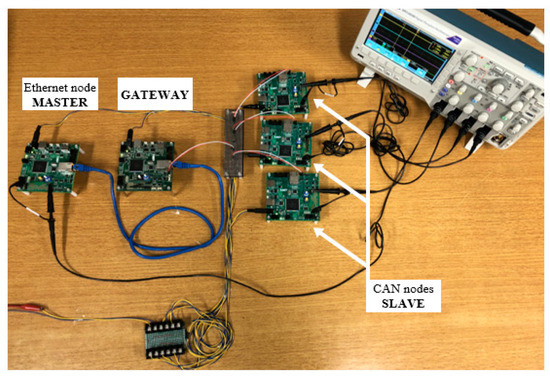 Figure 6 shows the experimental setup for the performance evaluation of the CAN–Ethernet network synchronization. Five NXP MPC5748-LCEVB modules were used for the nodes and gateway. MPC5748 is a chipset for vehicle use and supports CAN (CAN FD) and 100-Mbps Ethernet networks. The network topology for the performance evaluation comprised a master node (Ethernet), gateway, and three slave nodes (CAN), and an oscilloscope was used to measure the synchronization error. To emulate a CAN network with many nodes, CAN slave 3 was connected with a 15 m cable. To generate timestamps, each node used a software-based timestamp.