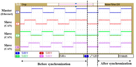 Figure 8 shows the oscilloscope measurement results of the synchronization error occurring in the four nodes after performing time synchronization in the CAN–Ethernet network. According to the measurements, when the proposed synchronization algorithm was applied, the maximum synchronization error between the master and slave was approximately 9.68 μs. Table 1 presents the synchronization error when the above experiment was repeated ten times. The average of the synchronization errors was approximately 8.18 µs, with a worst-case error of 9.68 μs. Although various factors can cause this error, the timestamp function, which measures and records time, is most likely to significantly influence this error, because it is operated by software.