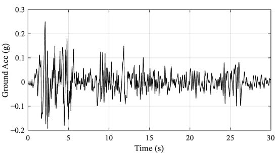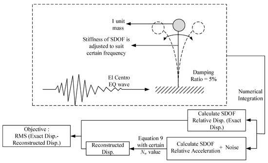 Besides acceleration data, another parameter needed for Equation (9) is the window size (Nw). Nw is affected by the frequency and interval time of acceleration records. To determine the size of Nw, this study utilizes a metaheuristic optimization technique to determine the appropriate Nw value for each frequency and interval. A single degree of freedom (SDOF) structure with various frequencies from 1–10 Hz with an increment of 1 Hz is generated, in which the accelerations are recorded in different time intervals such as 0.005 s, 0.01 s, and 0.02 s. As a result, 30 different cases are generated, and each SDOF structure is excited by the El Centro earthquake, as shown in Figure 2. Figure 3 shows the ground accelerations of El Centro. Since the structure and excited vibration are given, the exact displacement and acceleration of the structure can be calculated using the numerical integration method. The calculated structural accelerations are then added with noise and transformed to displacements using Equation (9). The added noise is an arbitrary random wave with frequencies between 1 to 200 Hz. In addition, the maximum amplitude of the added noise is twice the absolute mean of structural accelerations.