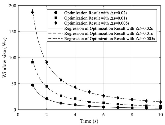 Metaheuristic optimization is performed to find the most suitable Nw value for each case. As illustrated in Figure 2, the objective of the optimization is to minimize root-mean-square error (RMSE) between exact and reconstructed displacements. Symbiotic organism search (SOS) [23] is used in this study. Although metaheuristic optimization probably needs more computational time compared to that of the conventional gradient-based optimization, metaheuristic optimization could avoid to trap at a local minimum point. Table 2 summarizes the metaheuristic optimization used in this study, including the values of parameters adopted. Figure 4 shows the optimization results of using the SOS algorithm. Based on the power regression lines, the formula for the Nw value could be formulated as shown in Equation (10), where f is the frequency of acceleration and Δt is interval time.
