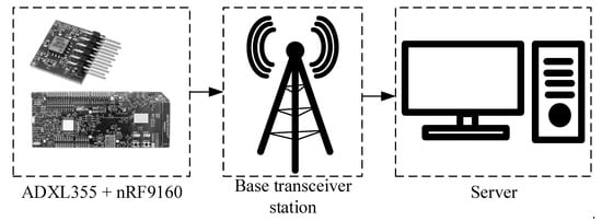 nRF9160 is equipped with long term evolution (LTE) with bandwidth 700–960 MHz and 1710–2200 MHz that will send the signal to base transceiver station (BTS) and to the off-site server as shown in Figure 6. The low-cost sensor and NB-IoT package with low power requirements enable the bridge monitoring to be performed at an acceptable price at length.