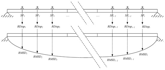 This section explains the proposed method that intends to detect damage occurrence and location. The proposed method utilizes the displacement reconstruction algorithm explained in an earlier section. In the bridge monitoring task, accelerometers often spread along a bridge span, as illustrated in Figure 7. Assuming that i number of sensor points (SP) spread along a bridge, as shown in Figure 7 and each sensor records acceleration data. If there is damage occurred, the collected accelerations naturally include two sets of records. Namely, the original and observed sets. These two sets of accelerations are then transformed into reconstructed displacements (RDisp) using Equation (10). The root-mean-square (RMS) of RDisp for each sensor point (RMSDi) is calculated as formulated in Equation (11).