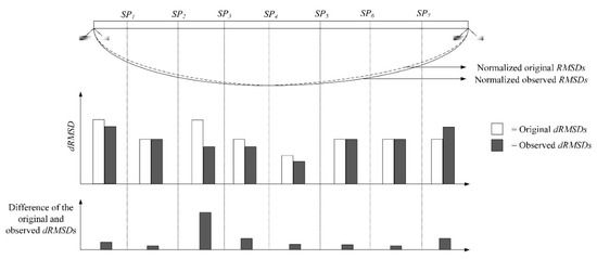). Same as Level 1 damage indicator, original and observed dRMSDs are computed as illustrated in Figure 9. Subsequently, the difference between original and observed dRMSDs are plotted with respect to the sensor point, as shown in Figure 9. Each segment of the bridge is represented by a single value of damage indicator (i.e., dRMSD) and If one of the values is particularly prominent, indicating that a particular segment is in a damaged status. The more sensors, the more accurate in locating the damaged position.