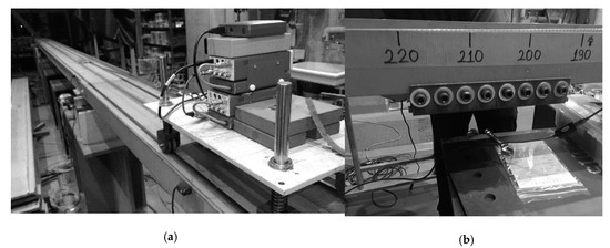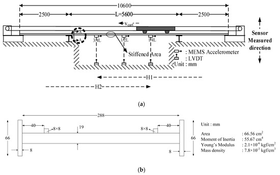 The experiment setup is shown in Figure 10, where the bridge has a 5.6 m span. During the testing, the excitation of the bridge is induced by a moving cart on the bridge span, as indicated in Figure 10. MEMS accelerometer with a sampling rate of 125 Hz and LVDT with a sampling rate of 200 Hz is equipped at the first quarter, middle, and the third quarter of the bridge as shown in Figure 10.
