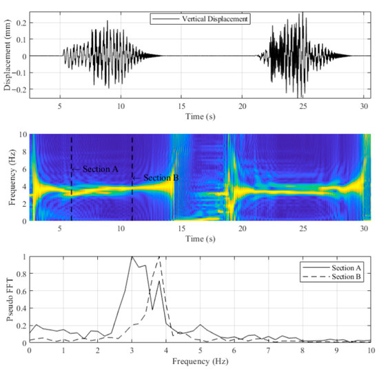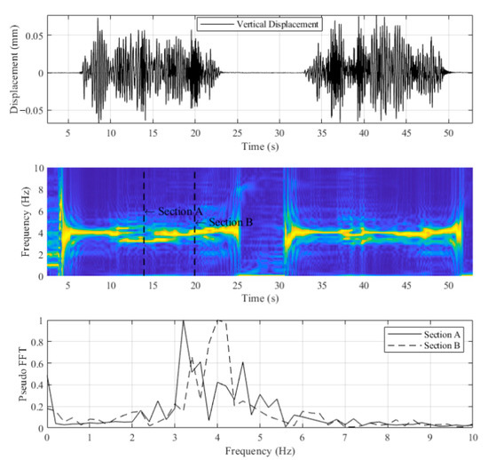 Instead of using direct FFT, FFT with window is performed. Results of windowed FFT are normalized to 1. Figure 12 and Figure 13 show the displacements and FFT spectrogram for scenario LVB0S1 and LVB0S3, respectively. Figure 12 and Figure 13 contain three plots. The first plot shows the dynamic displacement at mid-span under a moving load where the static displacement has been filtered out, and the second plot shows the FFT spectrogram, where each window contains 1000 data and 999 of them are overlapped with the next windows. The third plot presents two FFTs at different times indicated in the second plot. Figure 12 and Figure 13 show that different cart positions could yield different fundamental frequencies. Using frequency as a bridge health indicator with passing vehicles should be cautious.
