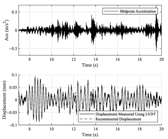 This subsection introduces the results of the Level 1 detection using reconstructed displacements explained in Section 2.1. As described, both MEMS accelerometers and LVDT are used for measurement, as shown in Figure 10a; comparisons between two devices are conducted to validate the accuracy of the proposed approach. Figure 14 and Figure 15 (top) shows the measured accelerations using MEMS for scenarios of LVB0S1 and LVB0S3, respectively. Figure 14 and Figure 15 (bottom) shows the displacements from LVDT and reconstructed displacement using MEMS for scenarios of LVB0S1 and LVB0S3, respectively. It is shown that reconstructed displacement is almost identical to those of LVDT. Note that noise has been filtered out in the reconstructed displacements.