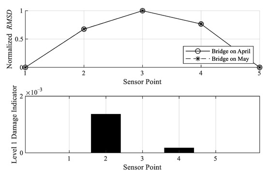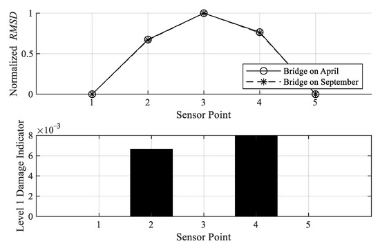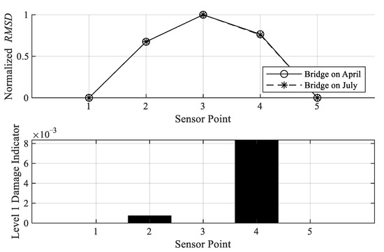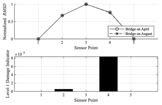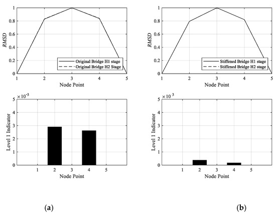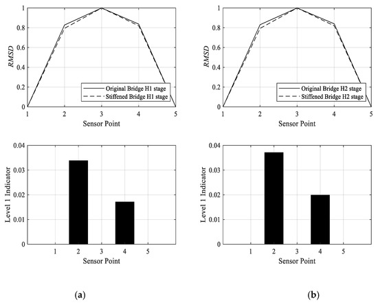 As shown in Figure 10, three accelerometers are attached to the bridge. To demonstrate the proposed approach, the mean value of RMSDs between original and stiffened bridges in the H1 direction is compared with those of the H2 direction. Figure 16 shows the mean RMSDs in H1 and H2 directions for (a) original (Cases 1 to 6) and (b) stiffened bridge (Cases 7 to 12). Points No. 1 and No. 5 represent the two ends of the test bridge, while points No. 2, No. 3, and No. 4 represent the sensor location at the first, second, and third quarters of the bridge. Figure 16 (top) clearly shows that the shapes created by the RMSD value have no significant change between H1 and H2 directions since both plots have identical conditions (only the cart moving direction is opposite). Level 1 damage indicator between H1 and H2 directions is less than 5 × 10−3. However, if the Level 1 damage indicator is compared between the original and stiffened bridges, the shapes are quite different from those of Figure 16. As shown in Figure 17, the Level 1 damage indicator is around 1.8 × 10−2 up to 3.5 × 10−2. The proposed indicator could recognize the occurrence of the stiffened plate while the frequency indicator could not. Need to be noted, the comparison is performed between Cases 1 to 6 and Cases 7 to 12 to reproduce the actual bridge conditions, in which a bridge is often passed by various vehicle types and vehicle speeds.