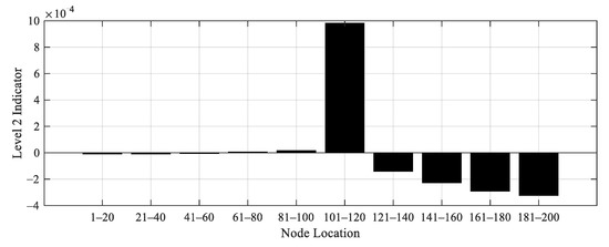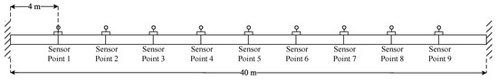 In this section, a numerical model is created to demonstrate the proposed method in recognizing the damage position for a given bridge, that is, the Level 2 damage detection. Because the accuracy of Level 2 damage detection depends on the number of sensors, a numerical model is more convenient to fulfill this requirement and is therefore adopted here. Only the vertical direction is considered in the numerical model. Both ends are fixed. Mass and stiffness are divided into 200 increments, and 9 sensors are uniformly distributed along the span. Figure 18 shows the bridge dimension and accelerometer positions. As shown, on a 40-m bridge, sensors are arranged every 4 m. The bridge consists of 200 finite elements with assigned mass and stiffness. For the given mass and stiffness, the mass and stiffness matrix could be constructed, and together with the damping matrix, the governing equation is displayed in Equation (13). The bridge property is listed in Table 9.