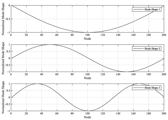 where M, C, and K are the structural mass, damping, and stiffness matrix, respectively. Dynamic analysis is conducted using the state–space method provided by MATLAB SIMULINK, where only displacement in the gravity direction is calculated. The vibration source in this numerical analysis is ambient vibration (), which is simulated by white noise with a frequency ranging from 1 to 10 Hz. Figure 19 shows the first three modes of the bridge, where the frequencies of the first three modes are 3.497, 6.994, and 10.490 Hz, respectively.