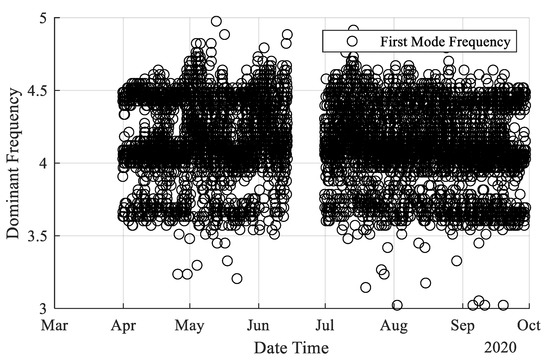 A full-scale bridge is used to demonstrate the implementation of the proposed Level 1 damage detecting method. Wenzhou Bridge, located in Taipei city, is selected as the test bridge because it is an important bridge, and the riverside park under the bridge provides test personnel to facilitate the assembly of test equipment. Wenzhou bridge is constructed in the Year 2000. It is a prestressed girder bridge with four lanes. No damage is visually detected before our testing. The experiments are initiated at the beginning of April 2020, and field data are continuously collected until now. Due to lack of information and based on the visual inspection, the status of the bridge in April 2020 is assumed to be in a healthy condition. Wenzhou Bridge is an RC prestress girder bridge with dimensions shown in Figure 26. Accelerometers integrated with NB-IoT are attached along the bridge span at the first, second, and third quarters. The power of the equipment is supported by several detached batteries that need to be refilled regularly. The sampling rate is 125 Hz, and acceleration data are recorded every 12 min. Each record consists of 4096 points. That is, each record is approximately 33 s-long. The collected acceleration data are transformed into displacements based on the proposed algorithm. Because the proposed reconstructed displacement algorithm requires the bridge’s fundamental frequency, FFT analysis is first performed to obtain the frequency, as shown in Figure 27. It is seen that a technical problem occurred from 6/15 to 6/30 (month/date), causing a gap in collecting data. However, such a gap does not affect the following analysis. The frequency of the bridge is assumed to be 4 Hz that is calculated based on the mean of the calculated FFTs. As explained in Section 3.1.2, different frequencies are observed, as shown in Figure 27, where the frequency is ranging from 3.5 Hz to 4.5 Hz.