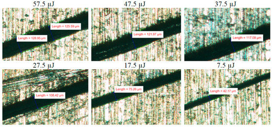 Figure 2 presents a 0.406 mm thick aluminum sample machined with the sub-picosecond laser. Each 1 cm line was scribed with different laser pulse energy. It was observed that crater width decreases with decreasing energy. There were no visible effects of the heat affected zone and no debris on the surface, even for much higher energies than the ablation threshold. Line edges were straight and clean, except for energies exceeding 37.5 µJ. The best results were obtained for 7.5–17.5 µJ. Crater depths obtained from 3D analysis varied from 2 to 5 µm and were decreasing with pulse energy as well. All samples were machined with 25 mm/s beam transition speed.