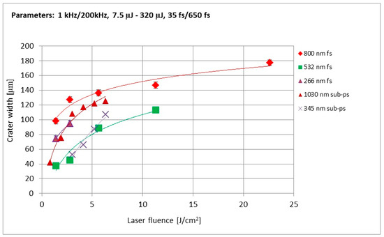 Figure 6 presents the results obtained with a Ti:S laser, using different wavelengths and pulse energy. Comparable to the Yb:KYW laser, crater width decreases with decreasing pulse energy. Still, the effect of the wavelength change was different. For aluminum, the material reflectivity is very high (above 90%) in UV-VIS, with a dip at 700–900 nm, and then increases with the wavelength in the far infrared range [15]. It can be predicted that the laser beam will be best absorbed in the near infrared window, and not in the UV range. This effect was confirmed for the Yb:KYW sub-picosecond laser, whereas for the femtosecond Ti:S laser, machining with 266 nm and 800 nm beam resulted in a similar crater size. The VIS range was poorly absorbed by aluminum sample; however, better absorption occurred for 532 nm in shorter, fs pulses, than for 345 nm in longer, sub-ps pulses.